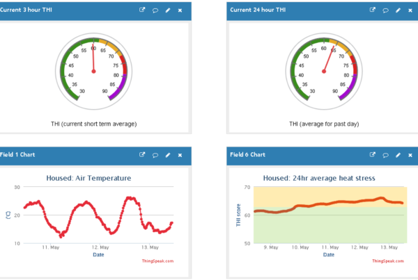 The image below shows the heat stress situation for housed cows on our monitor farm in Berkshire. The shed is a modern building with a high roof and large air volumes but it lies in a very sheltered valley. The heat load pattern is similar but slightly worse than for grazing cows.
