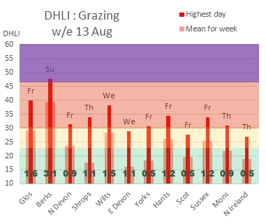 With the on-going poor weather one is tempted to forget about heat stress! However, now we are in the peak of the summer season, the underlying temperatures are all much warmer than earlier in the year. Any slight rise in temperature or a sunny afternoon is enough to push the cows up into heat stress. We saw this towards the end of last week. Grazing conditions have been much more variable than in the housing; at this time of year a sunny afternoon can heat up any cows that are not in the shade and increase the potential for milk yield losses. If the cows cannot get out of the sun fertility can be impacted and standing times will be increased (which can lead to lameness problems in 8 – 10 weeks due to solar-ulcers). Predicted maximal weekly average milk yield losses are more variable ranging from 0.5 to 3.1 liters a day all depending on how much direct sunshine the farm gets.