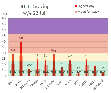The weekly average figures suggest that grazing cows on most of our monitor farms will have suffered very little heat stress in the past week due to a combination of lower temperatures and higher levels of cloud cover. However on days when the sun did shine DHLI scores and heat stress risks rose. The inland, southern farms suffered the most heat stress and sunny weather on Sunday (yesterday) pushed our Berkshire farm into a high risk of heat stress which would have been very uncomfortable for any grazing groups.